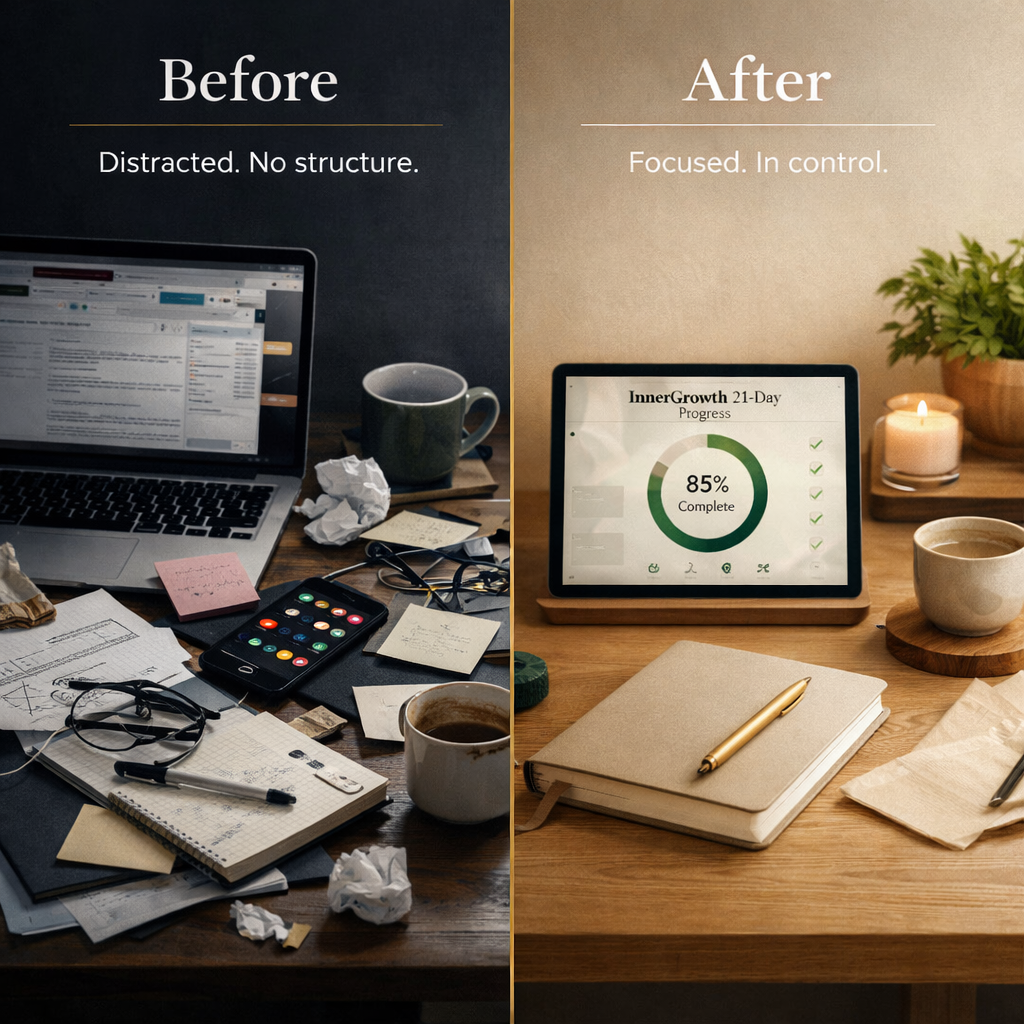 Daily Audio Lessons bring you deep, science-based insights on focus, resilience, habit formation and social confidence. Daily Challenges immediately convert insight into action. Visual Reminders and Motivational Messages prime your environment for consistency. Our exclusive Community gives you accountability and support. And your free access to the upcoming InnerGrowth App adds personalized challenges, tracking and tools to make your transformation seamless and sustainable.